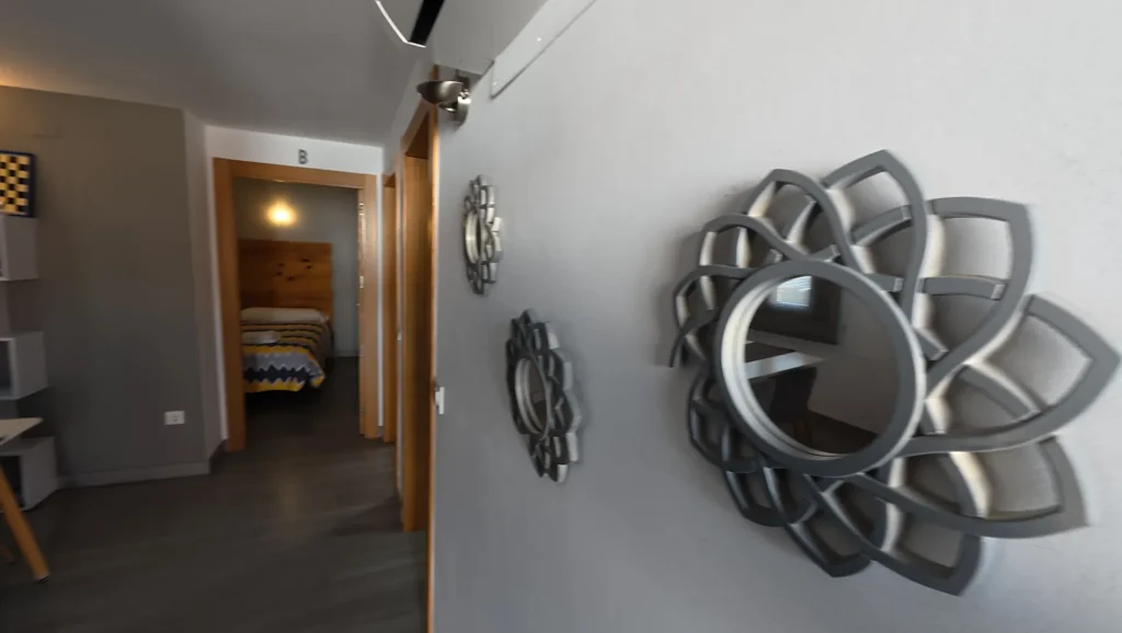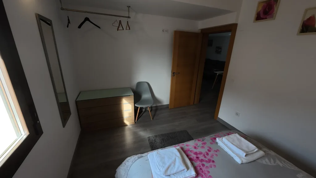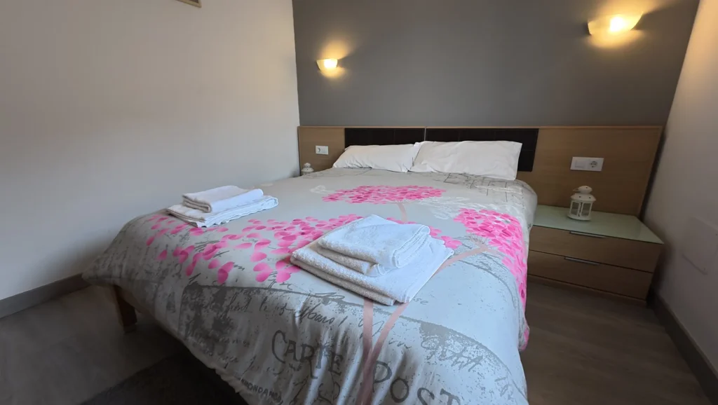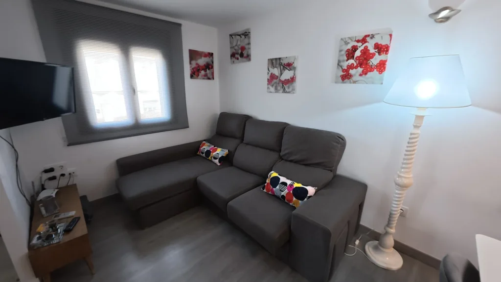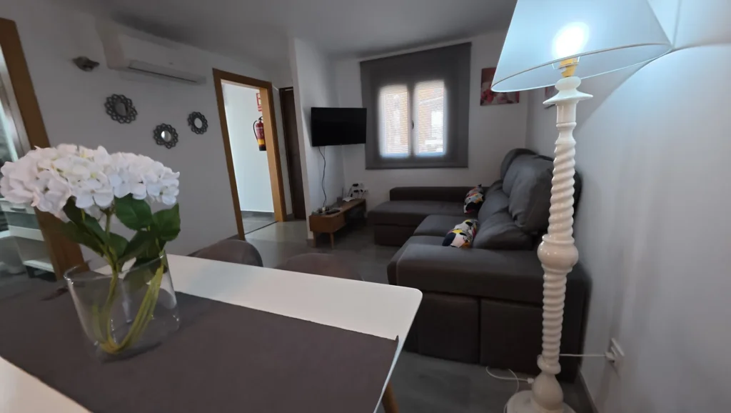 Muy luminoso, con amplias estancias y completamente exterior, dispone de recibidor, dos dormitorios (uno principal con cama de matrimonio de 150 x 190 cm y armario y otro doble con dos camas de 90 x 190 cm), un cuarto de baño, salón-comedor con sofá-cama y cocina completamente amueblada y equipada con multitud de pequeños electrodomésticos. Además, cuenta con una terraza con estupendas vistas del pueblo.