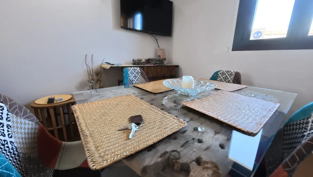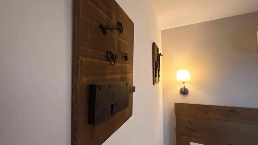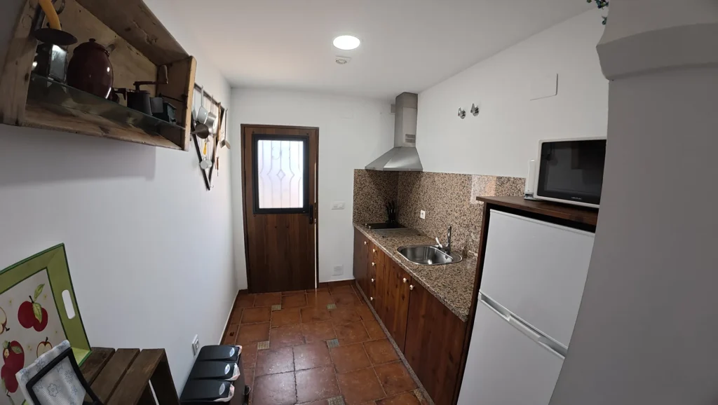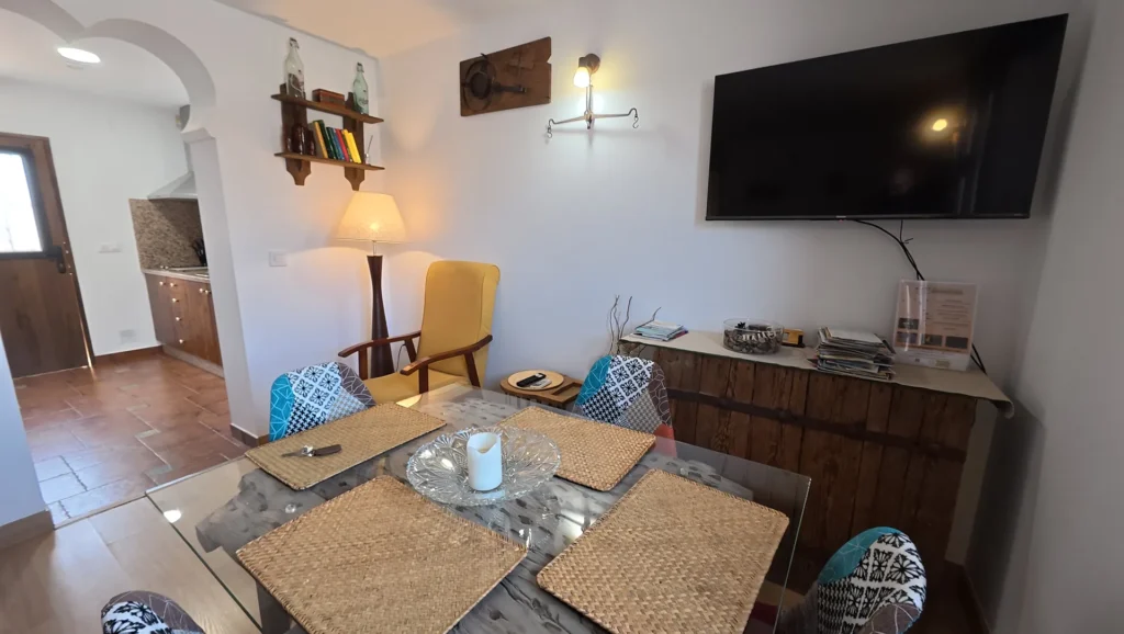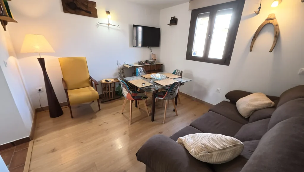 El mobilario que compone este apartamento es de tipo rústico, salpicado de multitud detalles que recuerdan al pasado, como herramientas de trabajo que nuestros antepasados utilizaban habitualmente en las arduas tareas del campo.